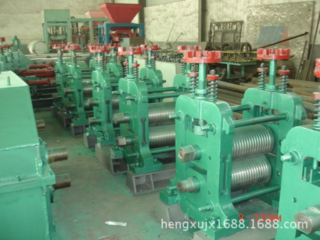 連續(xù)小型軋機(jī)所用坯料一般是連鑄小方坯,邊長一般是130-160mm,長度一般6-12m左右,坯料單重1.5-3噸。軋制線多為平立交替布置,實(shí)現(xiàn)全線無扭轉(zhuǎn)軋制,根據(jù)不同坯料規(guī)格和成品尺寸有18、20、22、24架的小型軋機(jī),18架為主流。目前棒材軋制多采用步進(jìn)式加熱爐、高壓水除鱗、低溫軋制、無頭軋制等新工藝,粗軋、中軋則向大坯料及提高軋制精度方向發(fā)展,精軋機(jī)主要是提高精度和速度,較高速度可達(dá)18m/s,產(chǎn)品規(guī)格一般為Ø10-40mm,也有Ø6-32mm或Ø12-50mm的。生產(chǎn)的鋼種為市場大量需求的低中高碳鋼、低合金鋼。其生產(chǎn)工藝流程是:步進(jìn)式加熱爐→粗軋機(jī)→中軋機(jī)→精軋機(jī)→水冷裝置→冷床→冷剪→自動(dòng)計(jì)數(shù)裝置→打捆機(jī)→切料臺架。
