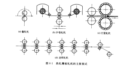 熱軋薄板有單張生產(chǎn)和成卷生產(chǎn)兩種生產(chǎn)方式,圖6-1所示為熱軋薄板軋機(jī)的主要型式。單張熱軋薄板主要是在單輥驅(qū)動的二輾不可逆式軋機(jī)上用疊軋的方法進(jìn)行生產(chǎn),國內(nèi)1200疊軋薄板機(jī)屬于這一類,其成品厚度為0.2~3.7mm。這類軋機(jī)工藝簡單,設(shè)備少,故投資少,建廠快。但其勞動強(qiáng)度大,生產(chǎn)率低,金屬消耗大,板材表面質(zhì)量不高,目前處于淘汰地位。