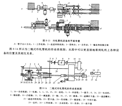 目前用冷軋的方法可以軋制直徑為 φ4~450mm、厚度為0.2~35mm管材。所用軋機(jī)主要為二輥式冷軋管機(jī)和多輥式冷軋管機(jī)。冷軋管機(jī)本身由各種設(shè)備和機(jī)構(gòu)組成,一般包括以下幾個(gè)部分。
